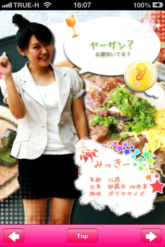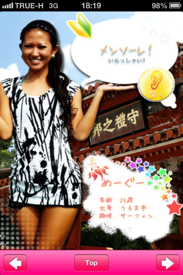 この沖縄弁(ウチナーグチ)アプリですが、1つづつ沖縄美人が沖縄弁を紹介していて、クリックすると沖縄弁をしゃべります。