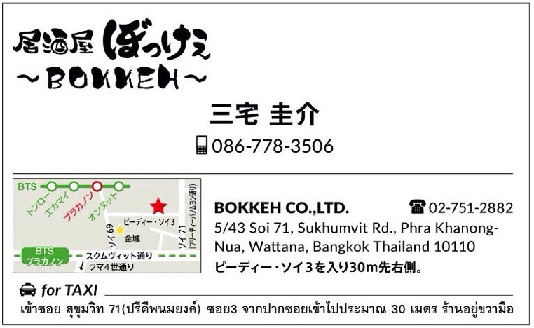 居酒屋ぼっけぇ BOKKEH住所:5/43 Soi71, Sukhumvit Rd., Phra Khanong-Nua, Wattana, Bangkok Thailand 10110