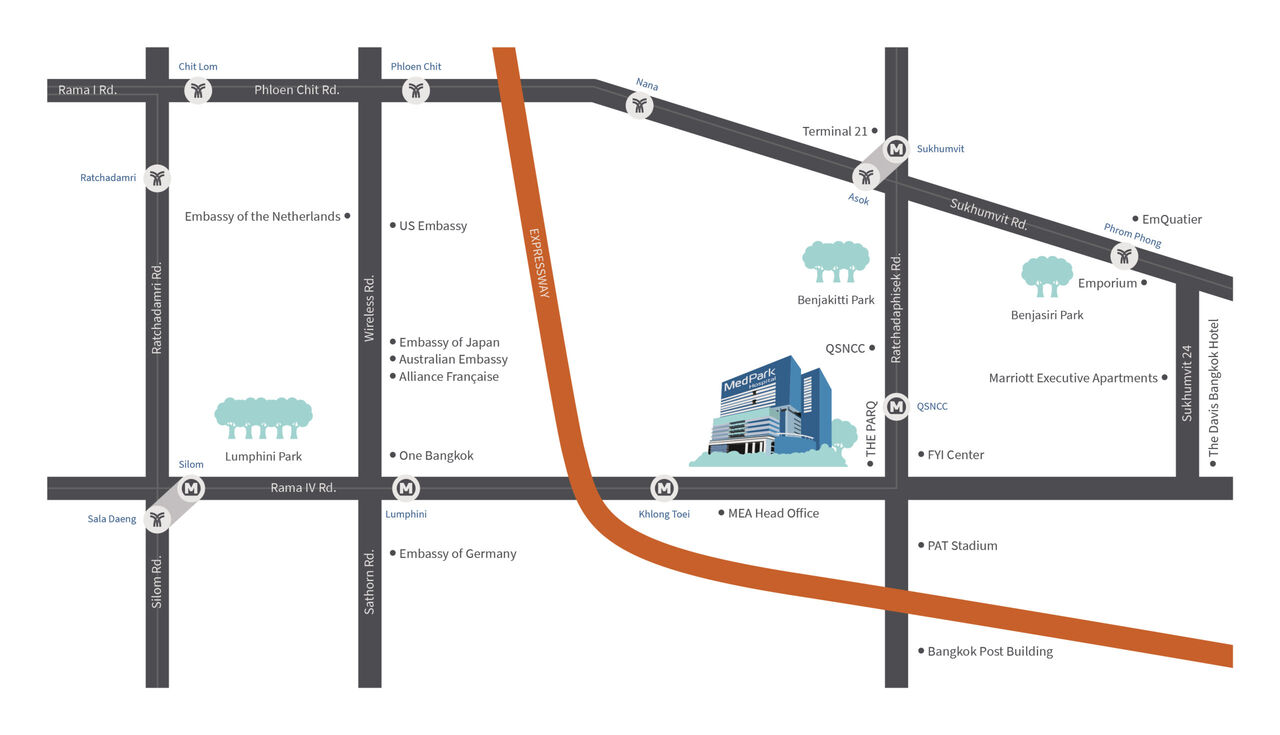 メドパークホスピタルの場所は、ラマ4世通り沿いで、地下鉄クロントイ駅2番出口近くになります。
