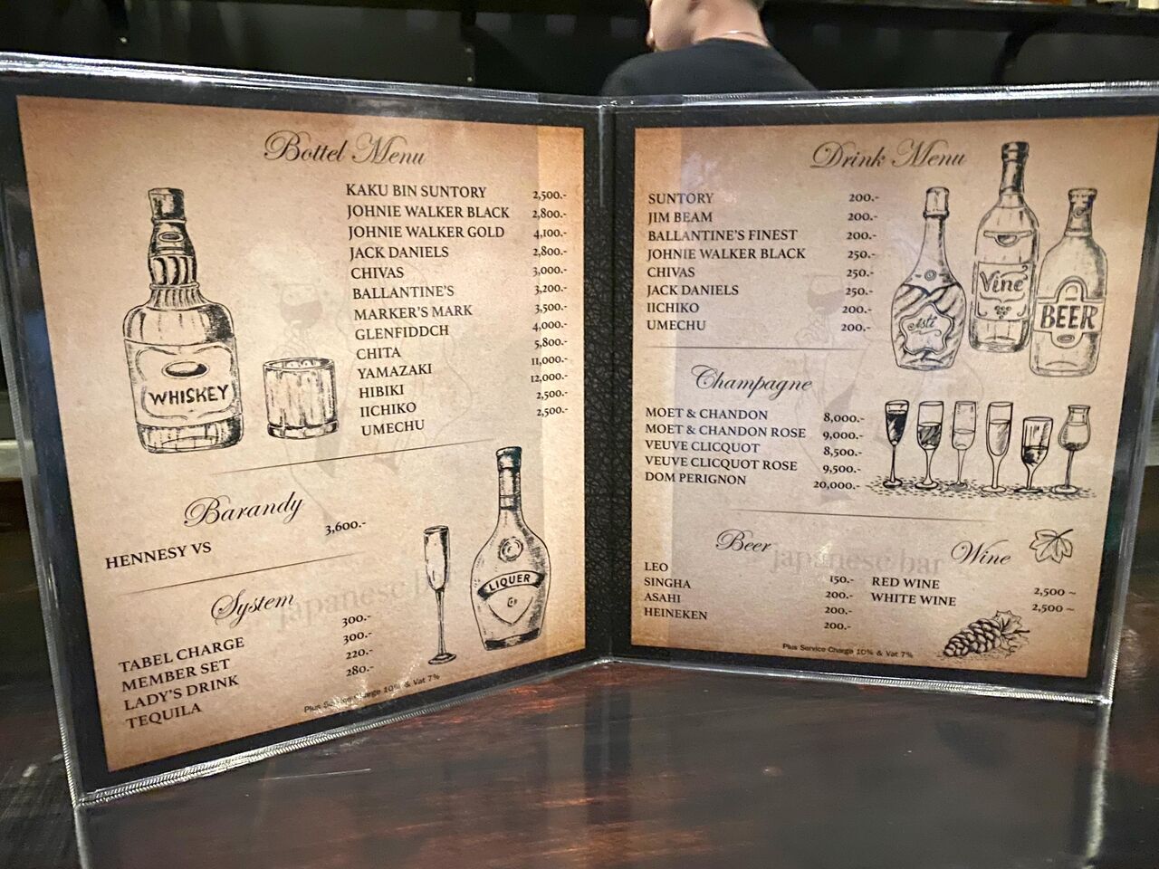 ビールやウイスキーをグラスで飲む方は、テーブルチャージ300B(1時間)で、ボトルキープの方は、テーブルチャージは無しで、メンバーセット300B(時間制限なし)になります。ボトルキープしたら、300Bで飲めちゃうのは、お得ですね〜。
