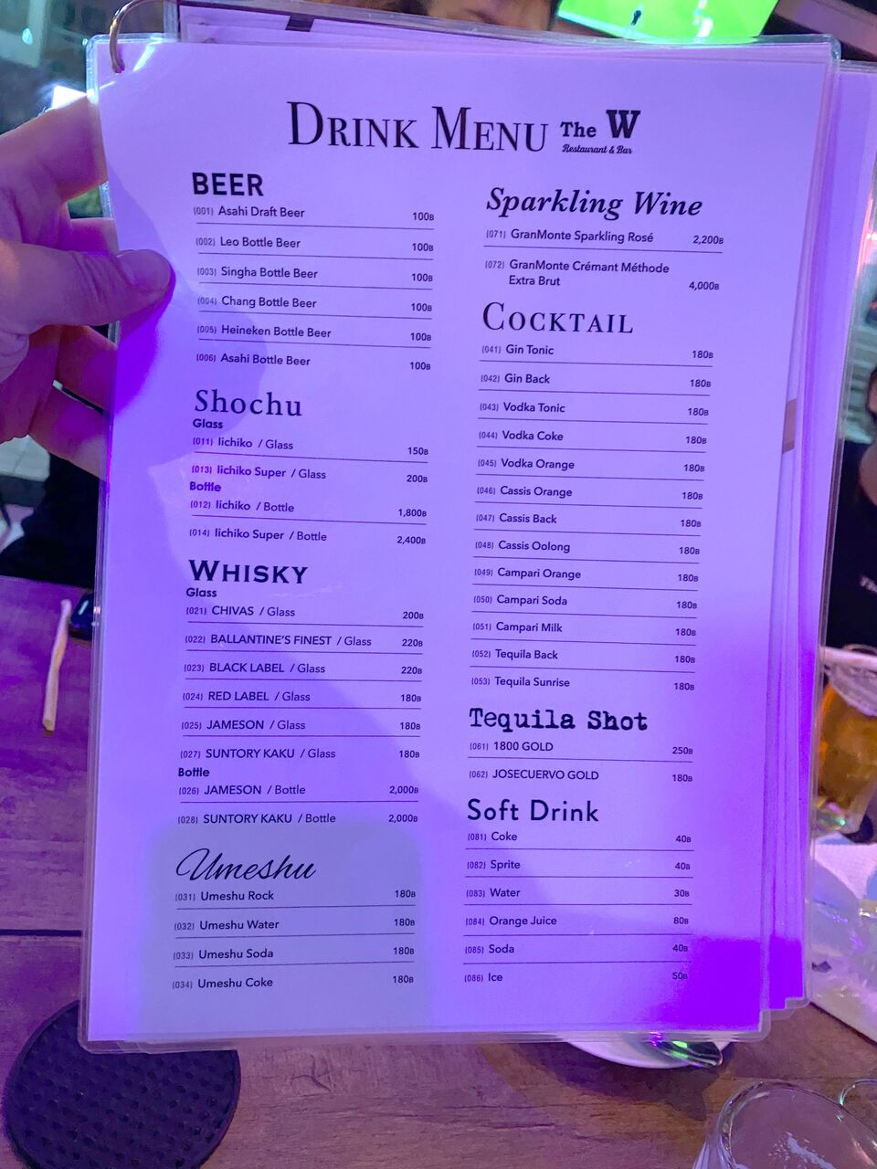 こちらが、ドリンクメニューです。ビールが、どれも100B等、値段設定がお得ですね〜。