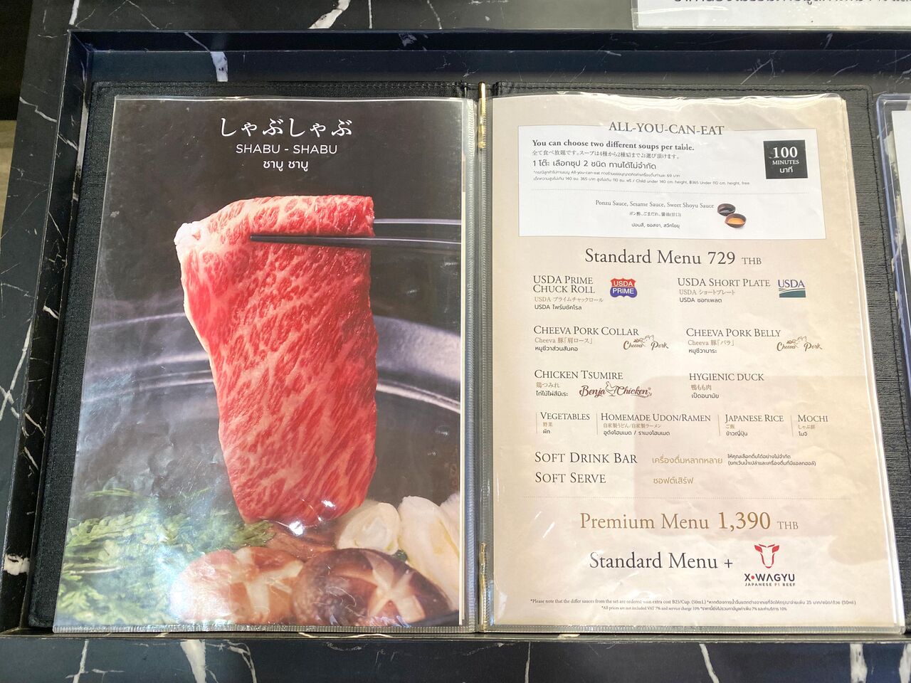 100分間の食べ放題になり、スタンダートメニュー(729B++)と、和牛も食べ放題のプレミアムメニュー(1390B++)があります。