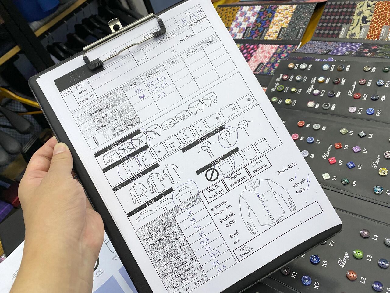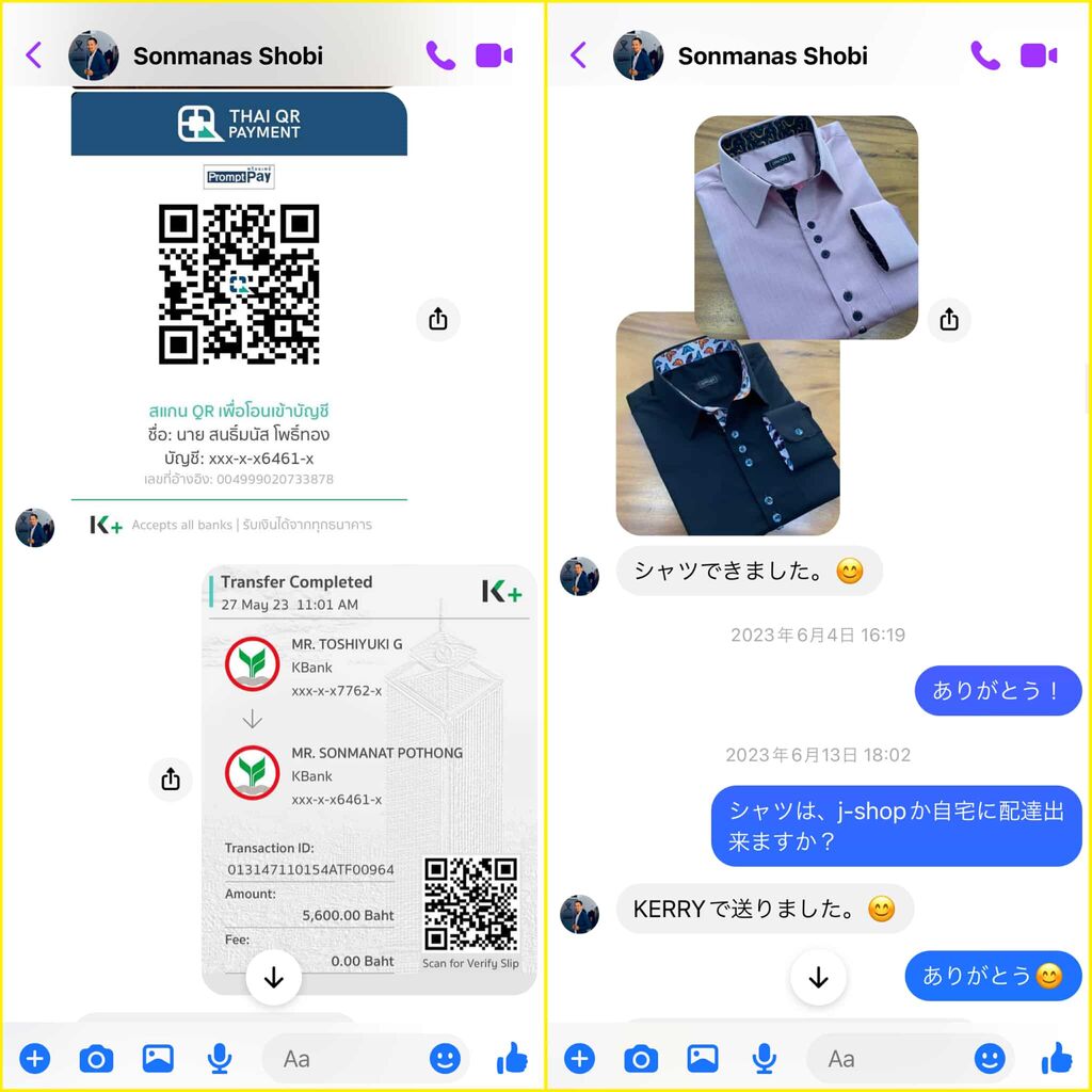 最近では、Facebookメッセージにて、オーダーしてます。生地のサンプル写真を送ってもらい、生地・裏地・ボタンを指定、あとはQRコードで振り込みして、出来上がり後は、バンコクまで送ってもらいました!