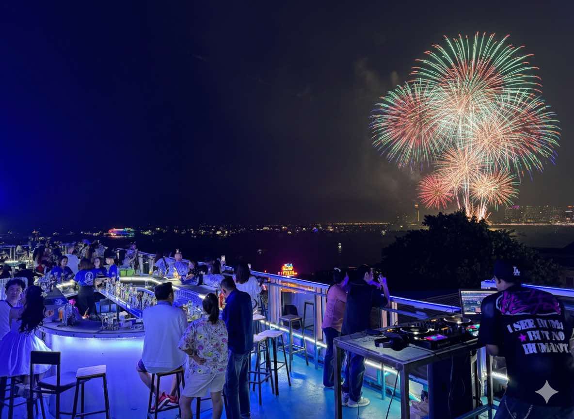眺めの良い、ウッドボールパタヤビーチ店屋上のスカイバーにて、満天の打ち上げ花火をお楽しみください!