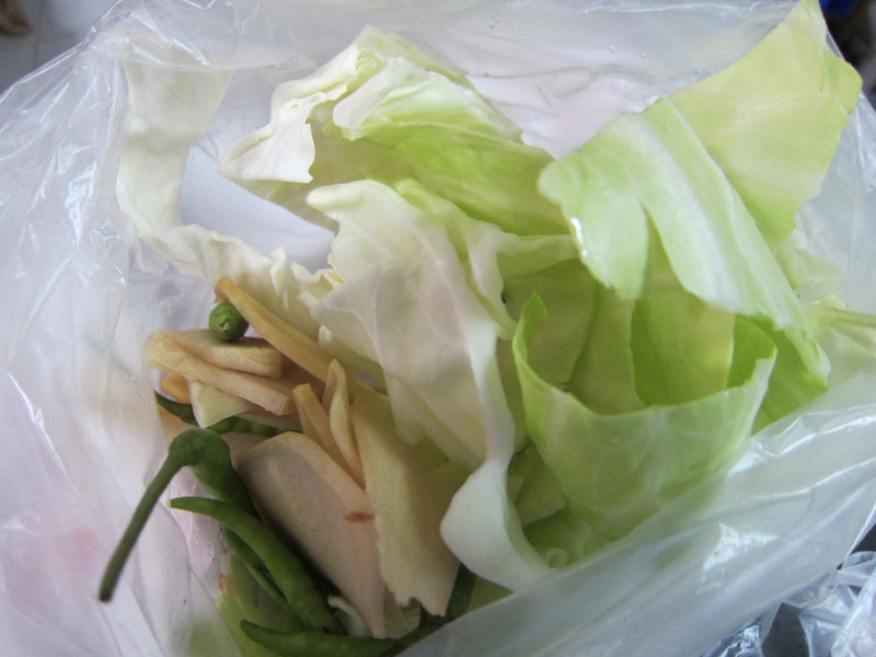 一口サイコークをかじり、付け合せのキャベツと生姜をほおばります。旨いです!タイの方は唐辛子をかじりながら、食べますが、僕はちょっと辛いのでやめました・・・