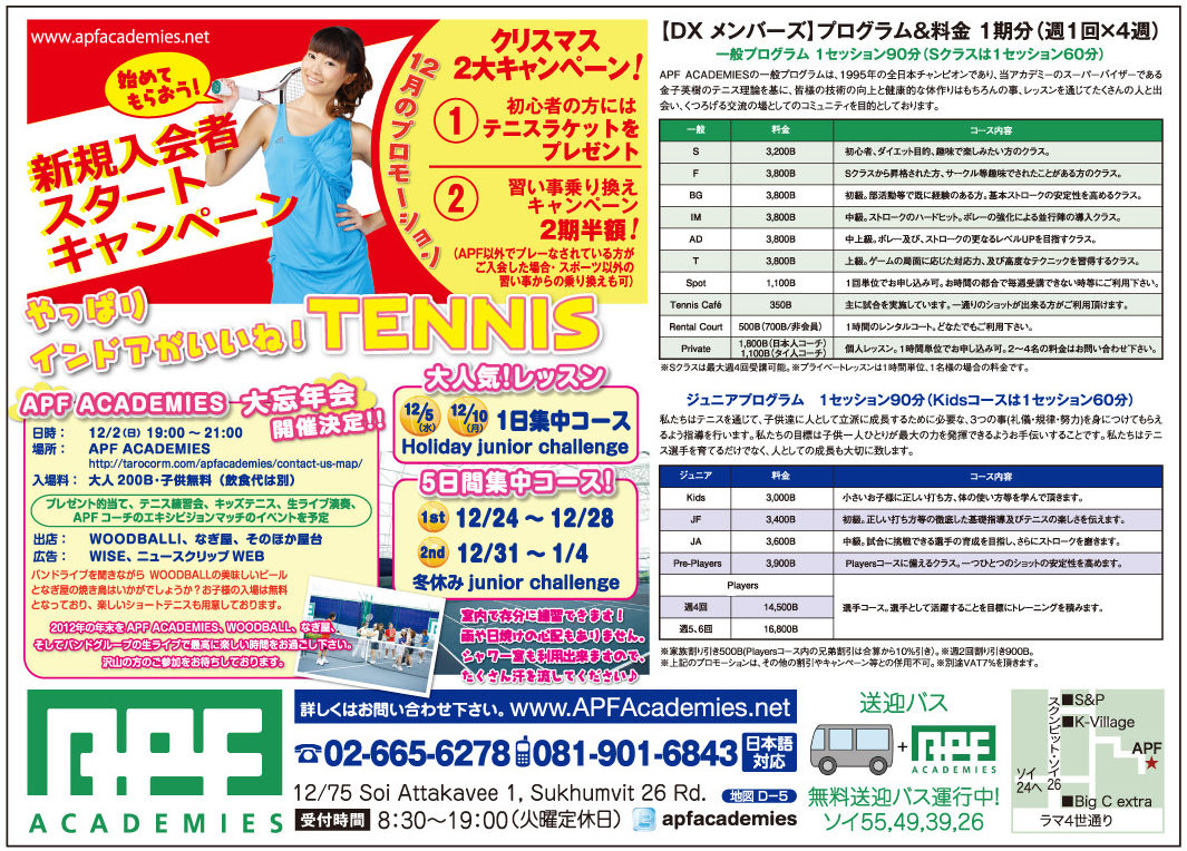 またまたイベントです。本日14日18時より、スクンビットsoi26のAPFテニスアカデミーにて、忘年会への出張ウッドボール&なぎ屋します!