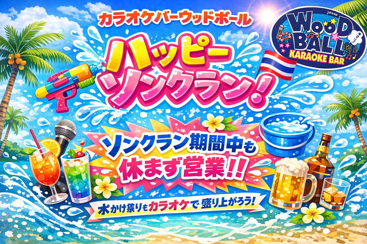 【ハッピーソンクラン】ウッドボール各店、オリオンスナックバー、おでん青葉、深夜食堂は、ソンクラン期間中も休まず営業いたします☆