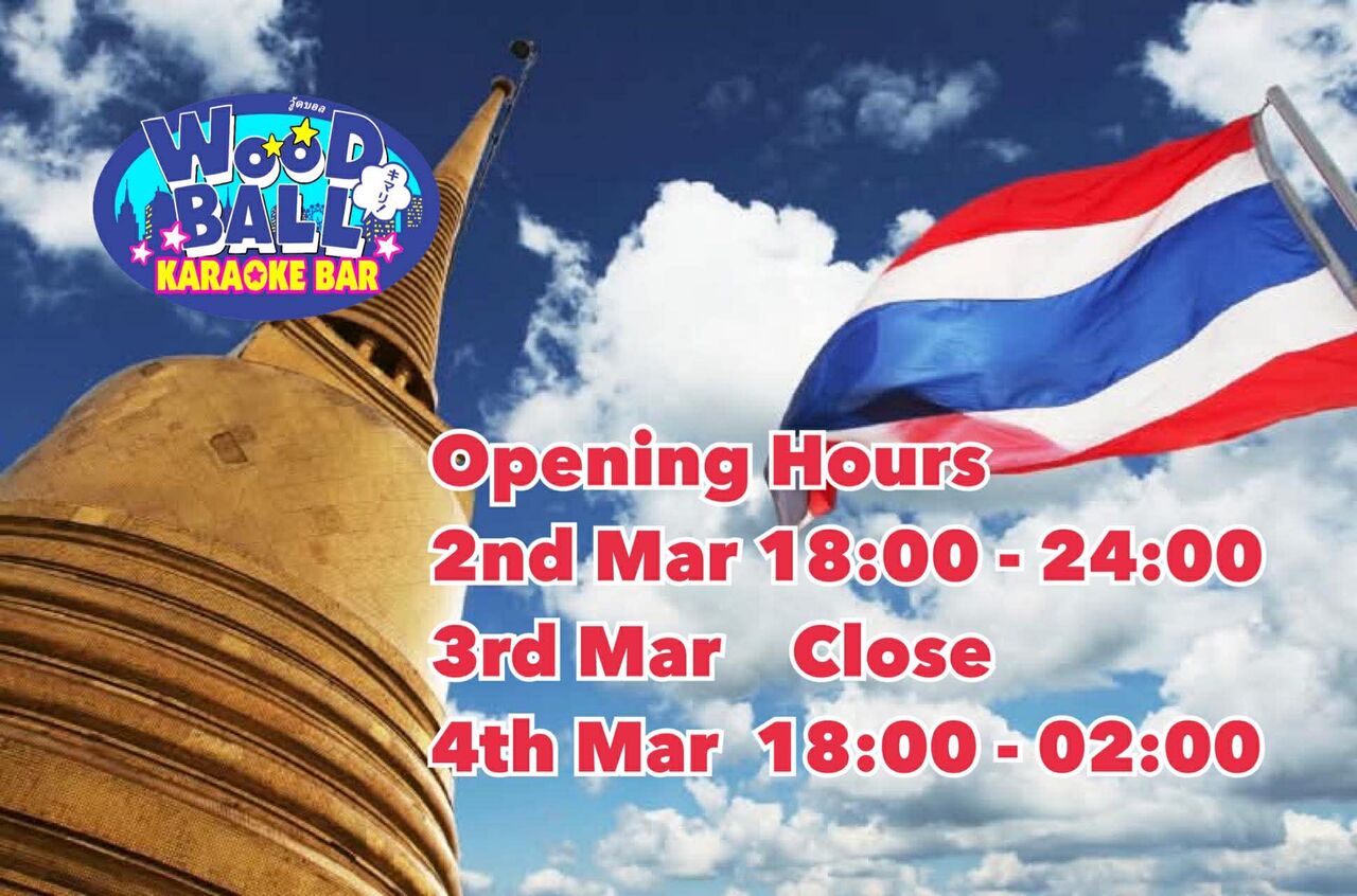 【お知らせ】3月3日は、仏教日で禁酒日のため、ウッドボールトンロー店、プロンポン店、タニヤ店、ナナ店、シラチャ店、オリオンスナックバー、おでん青葉は、お休みになります。