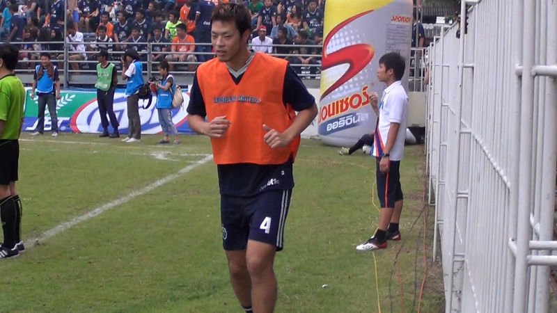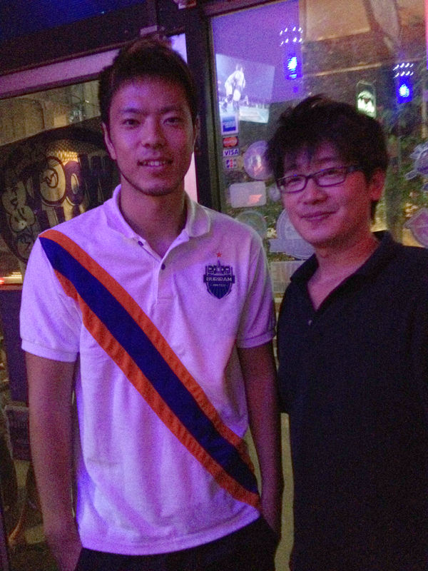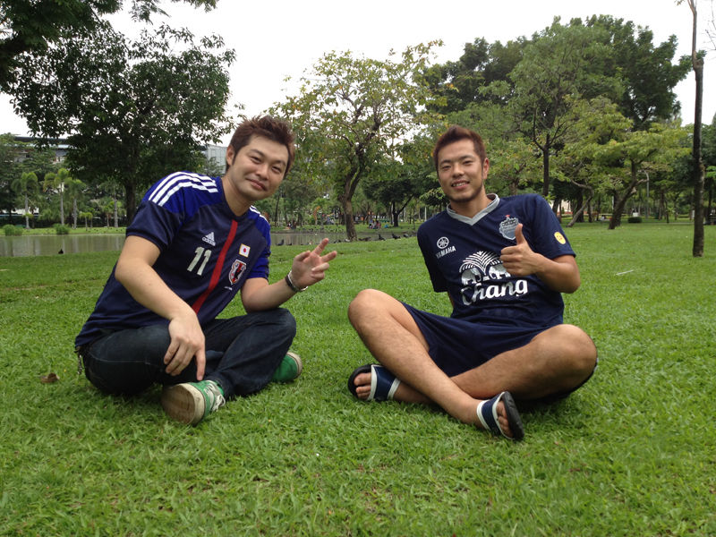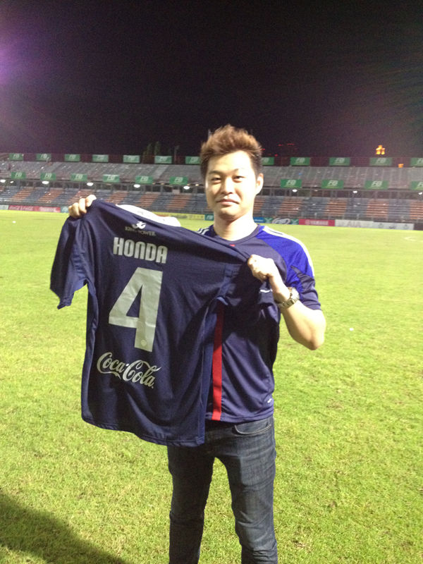 前半は2対0とタイポートFCがリードしてハーフタイムです。ハーフタイム中に本田選手とパチリ。本田選手はまだ出場していません。