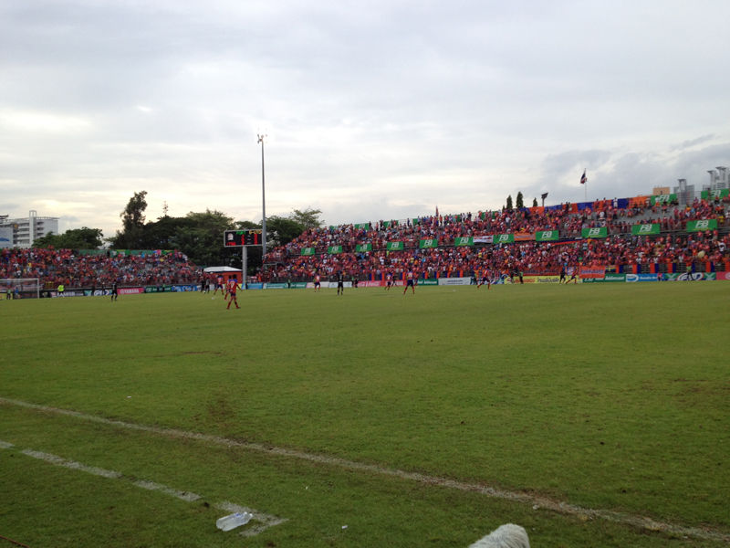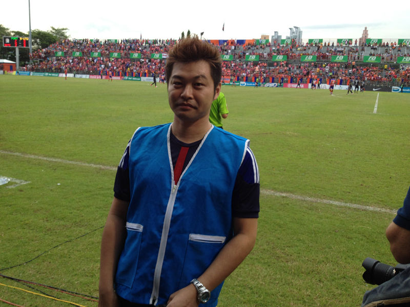 タイのサッカーは初めて見に来ましたが、すごい人と熱気です!山ちゃんの計らいで取材パスをもらい、選手の目の前で観戦しました。