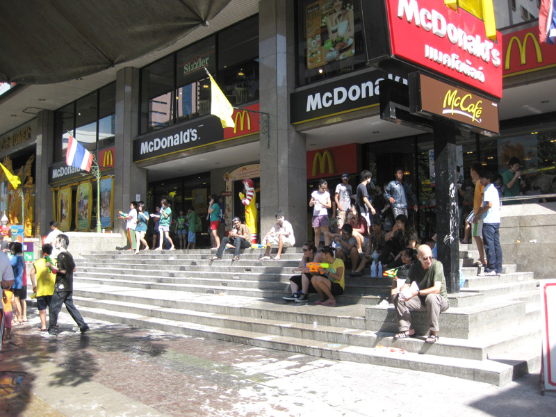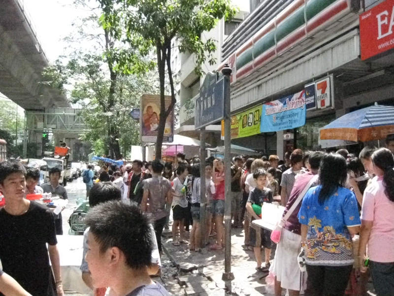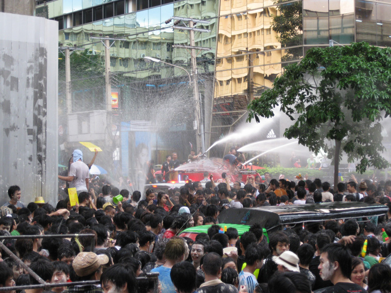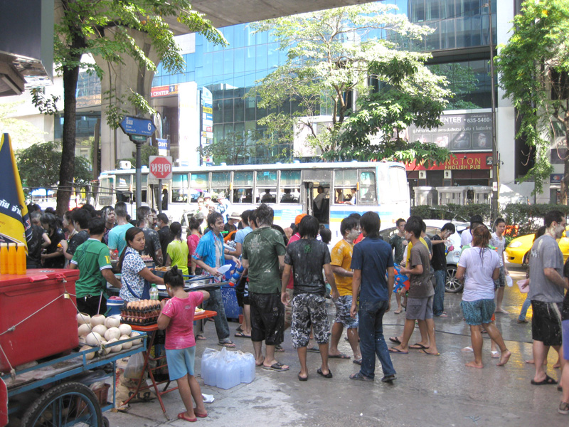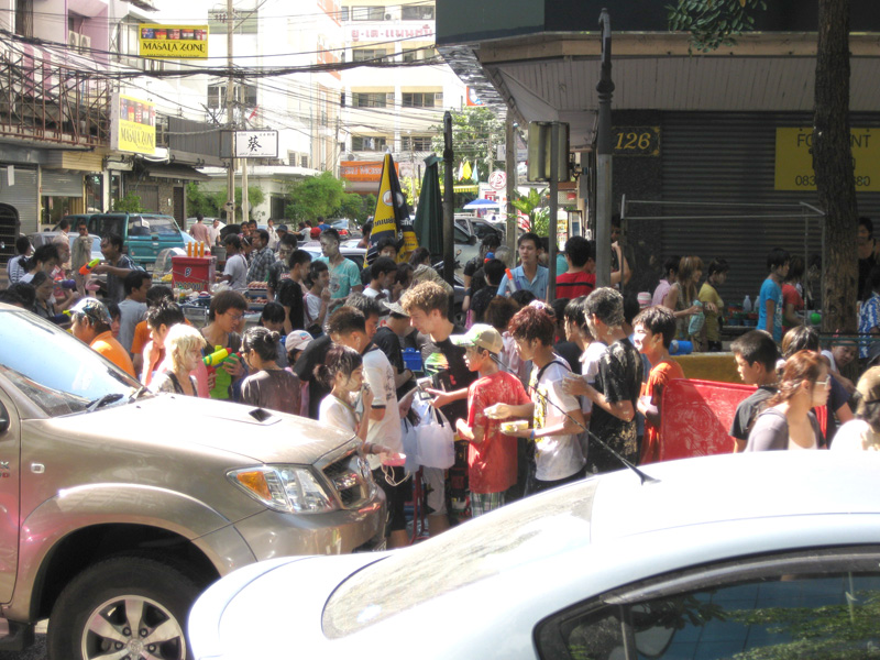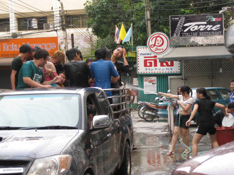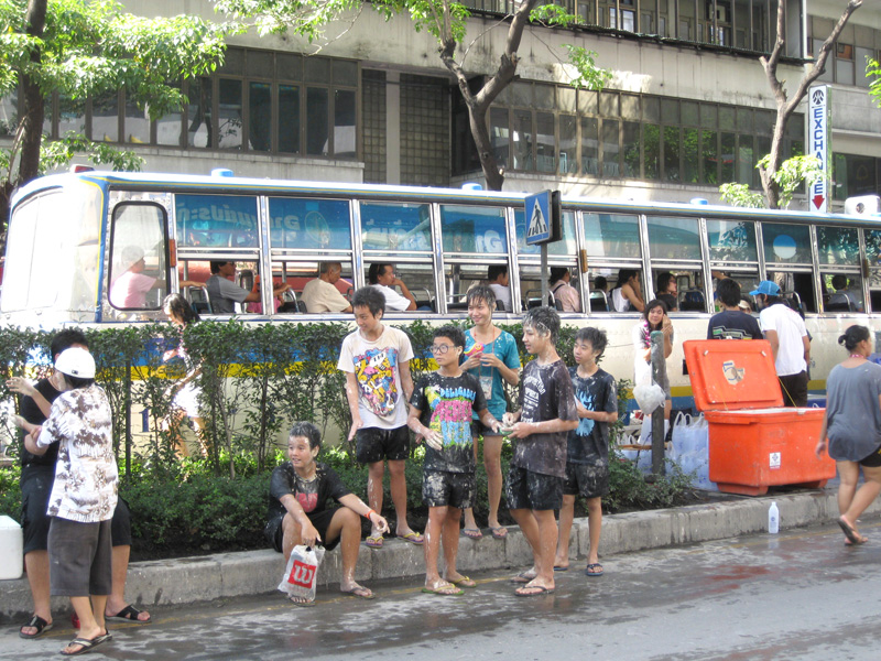 こちらはバンコククリスチャン病院前です。みんなトラックの荷台に乗って、道ゆく人に水を掛けてます。